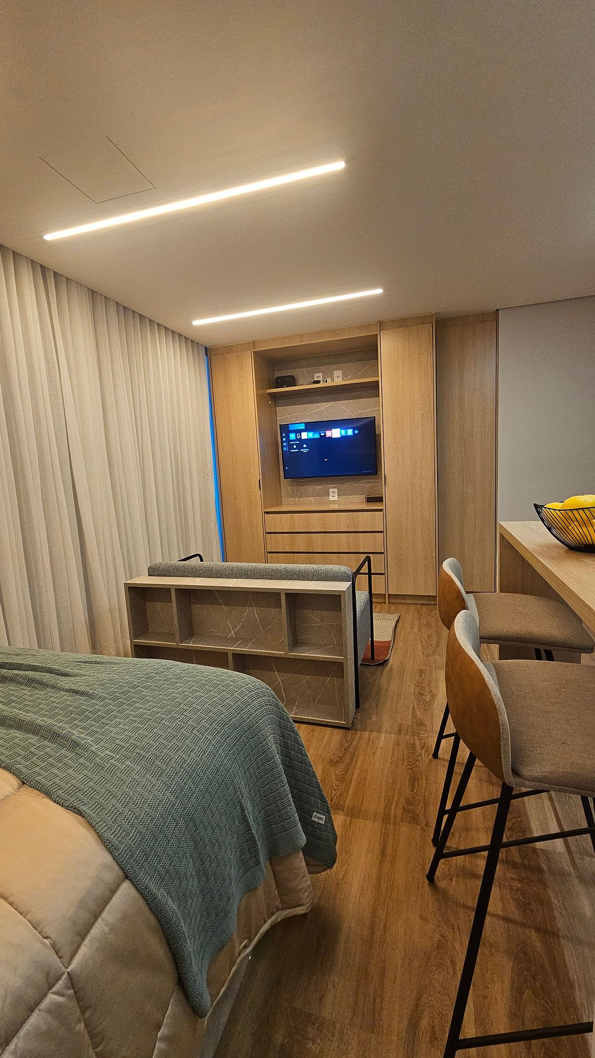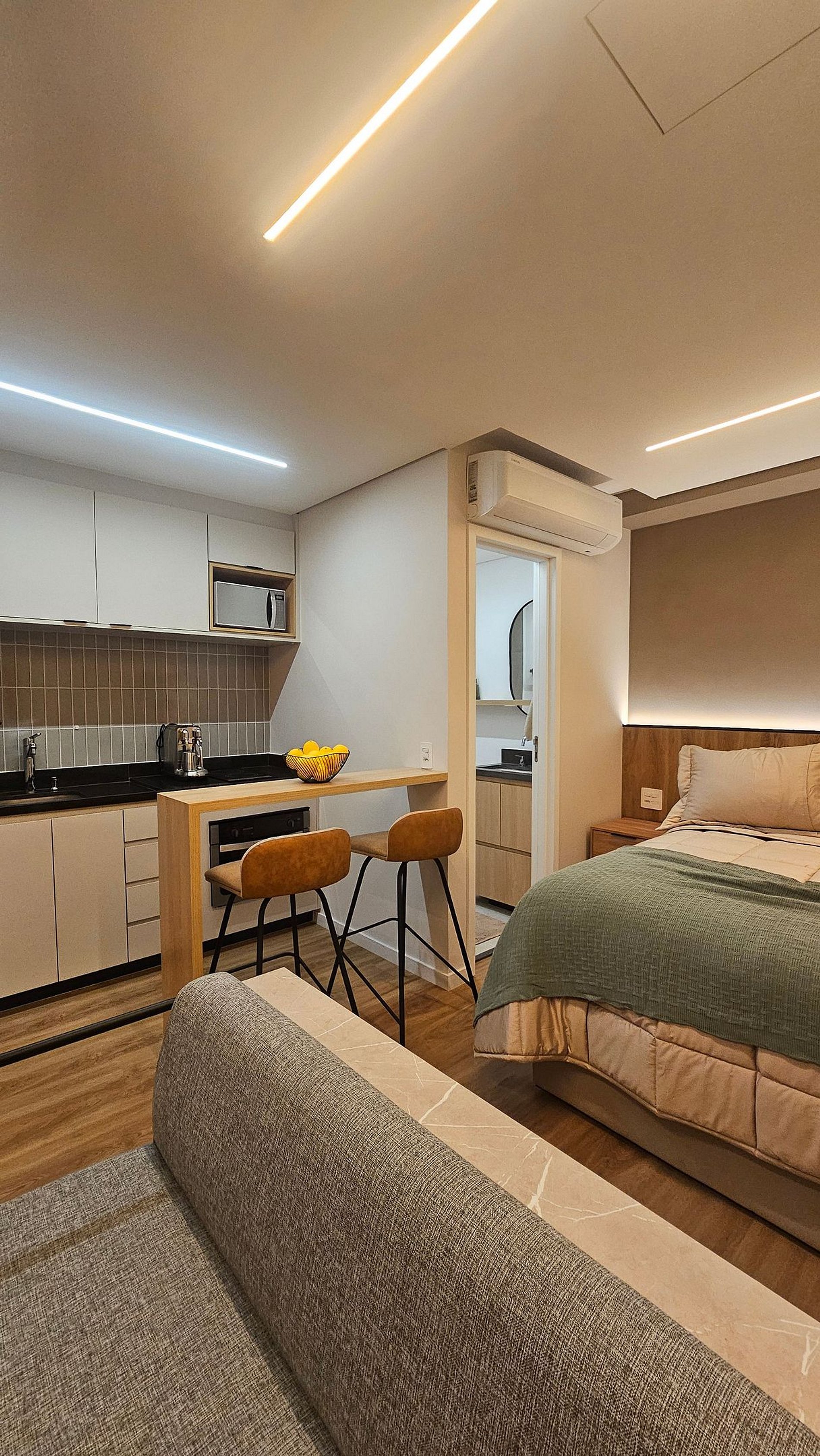 Nosso estúdio foi preparado com atenção a cada detalhe para oferecer uma estadia prática, confortável e sem imprevistos. O hóspede conta com check-in autônomo e flexível, internet de alta velocidade, máquina Nespresso (basta trazer suas cápsulas favoritas) e enxoval completo de cama e banho.