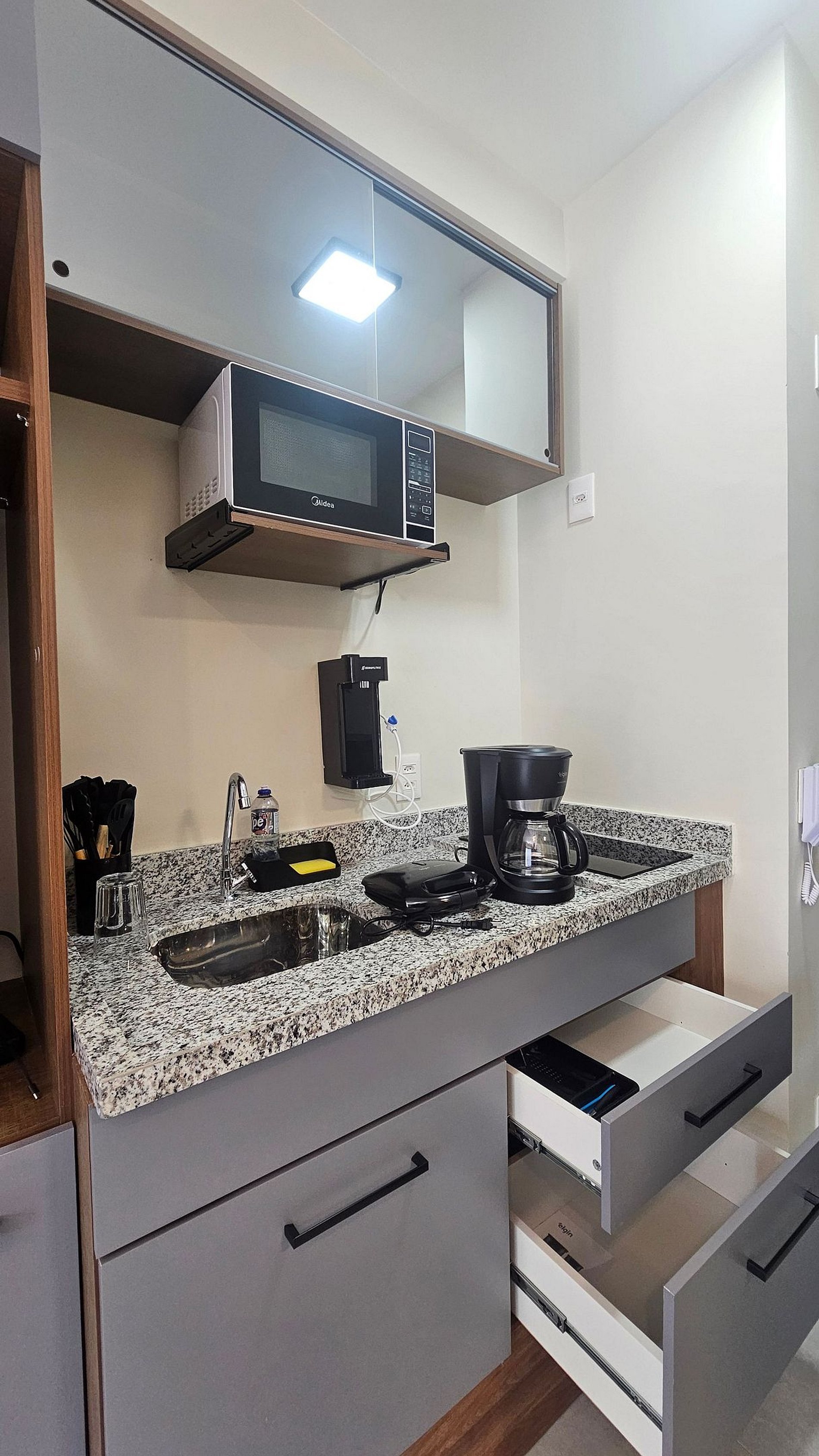 O studio é totalmente mobiliado e equipado, pronto para uso.