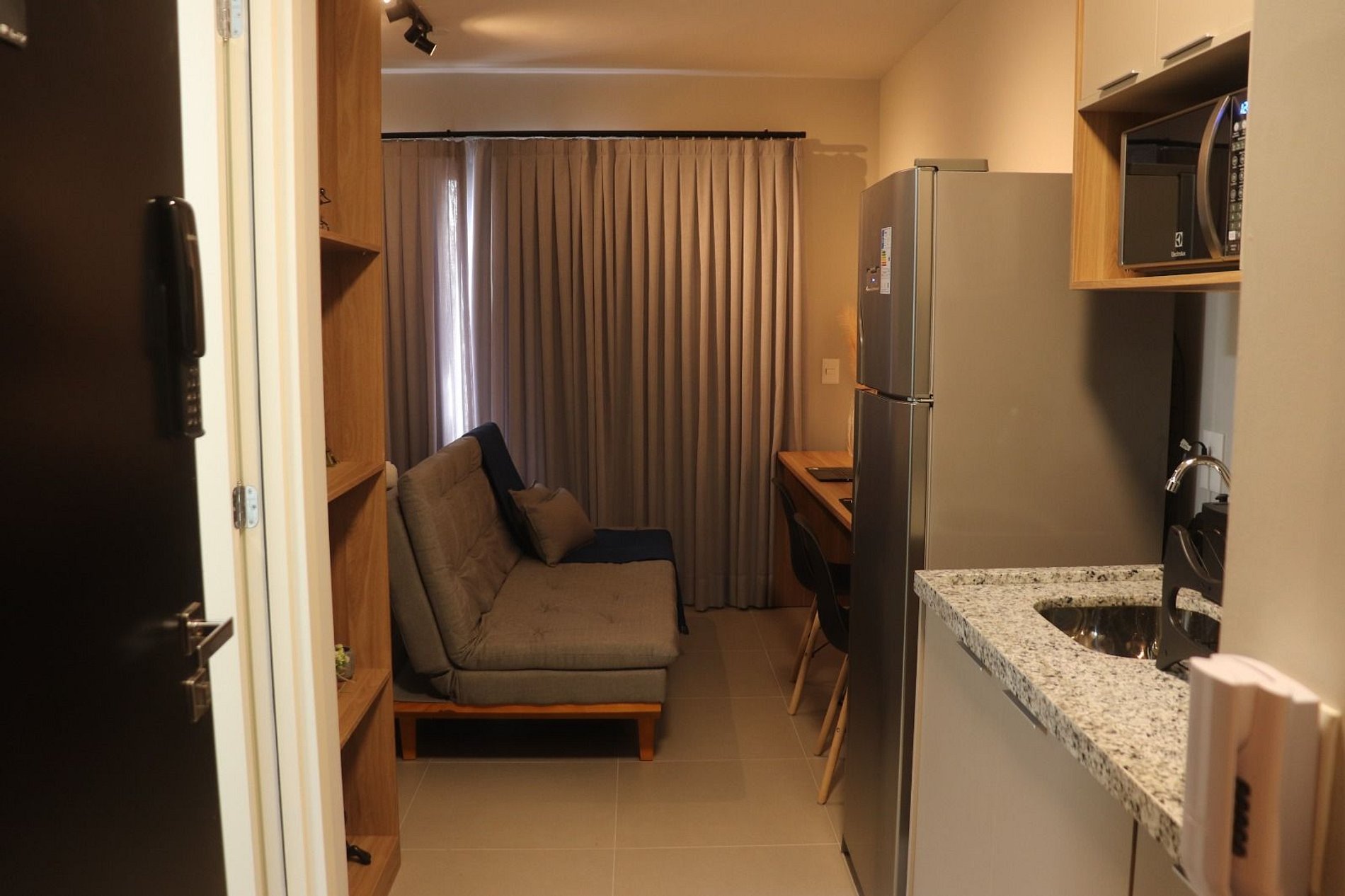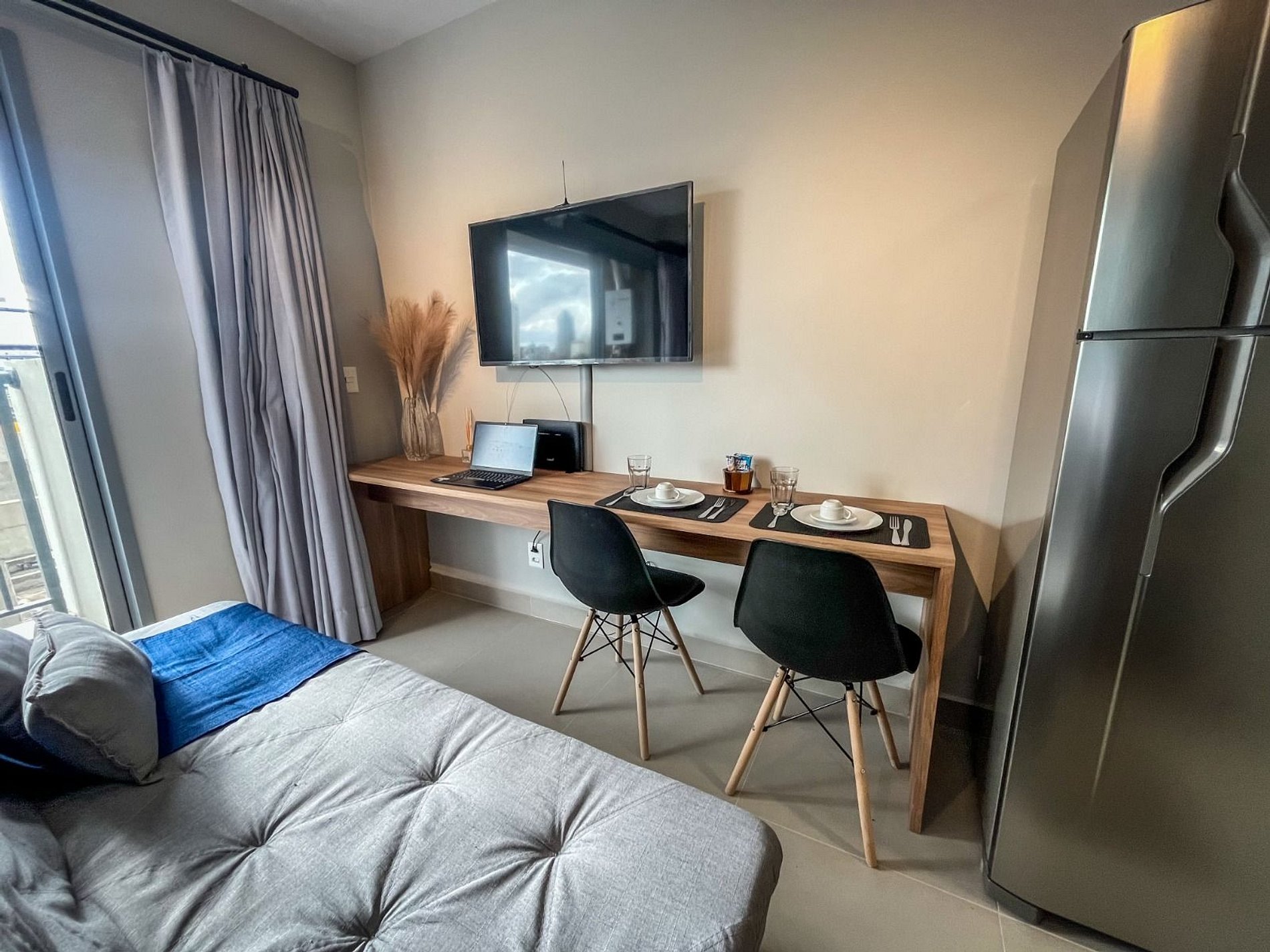 O studio é totalmente mobiliado e equipado, pronto para uso.